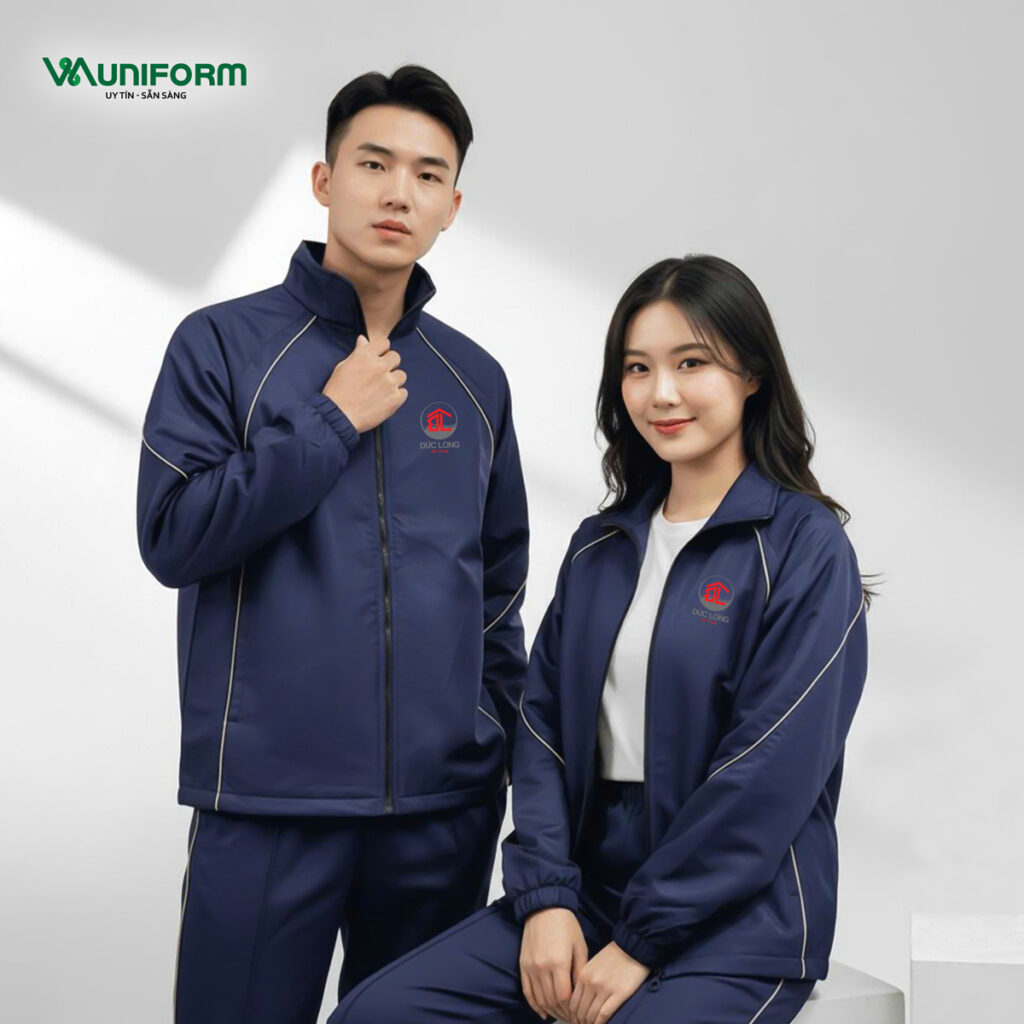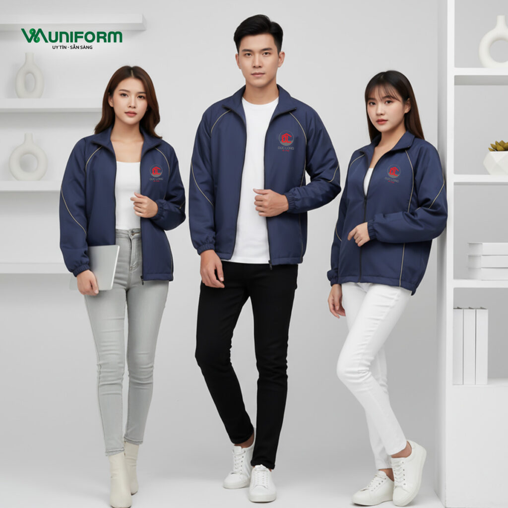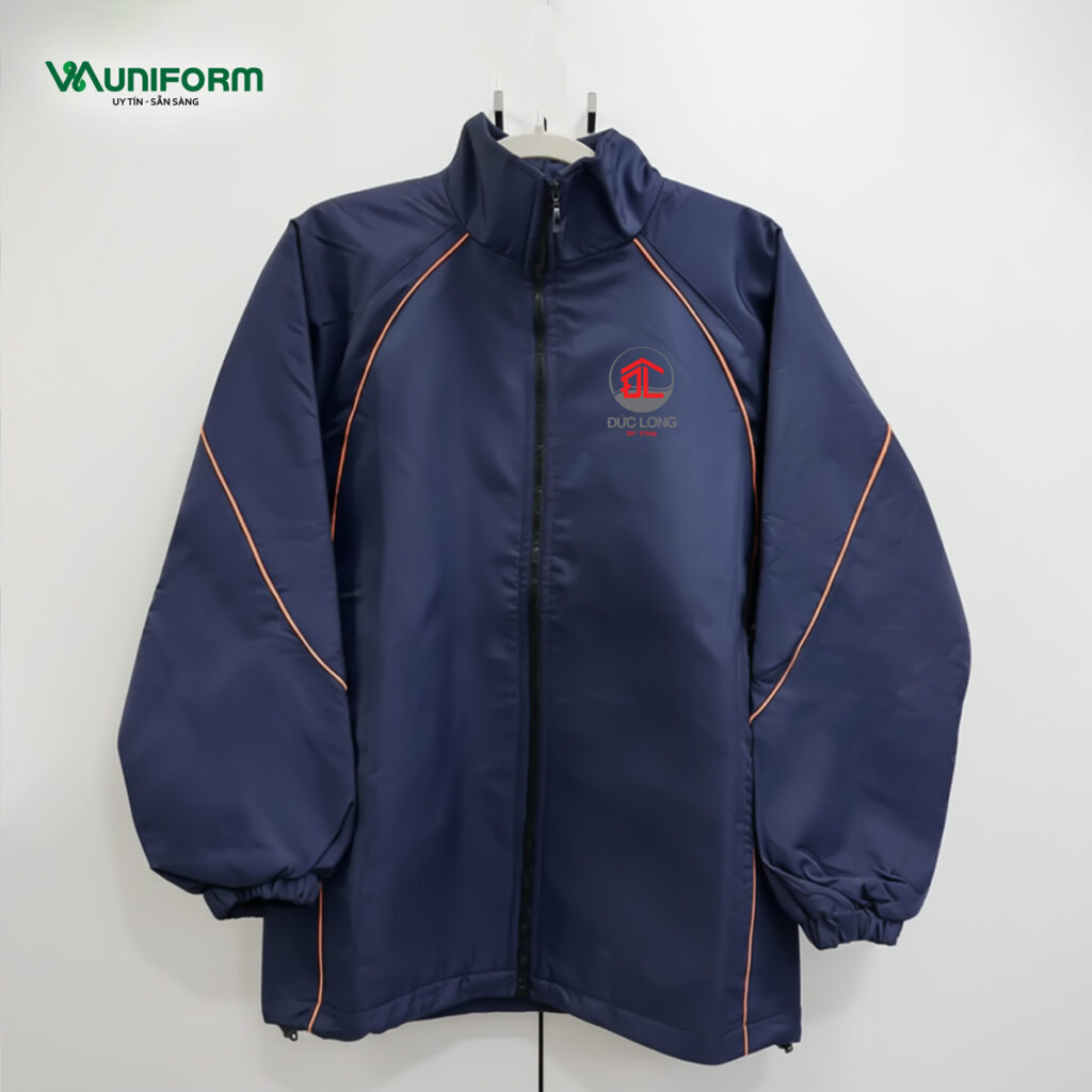 Logo trên áo khoác đồng phục được in decal nhiệt hoặc thêu vi tính cao cấp, đảm bảo rõ nét, không bong tróc, không phai màu sau nhiều lần giặt – giúp đồng phục luôn bền đẹp theo thời gian.